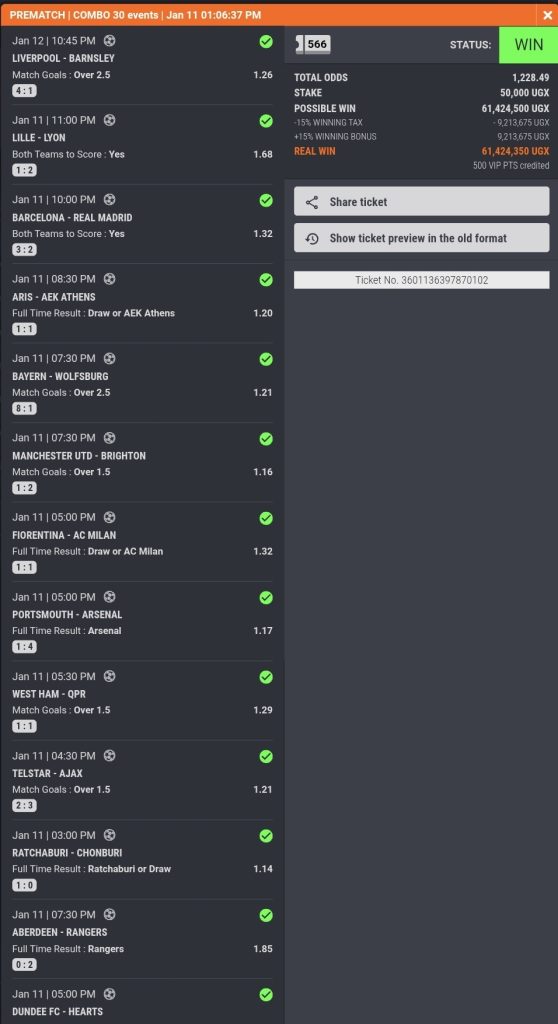 From the winners’ desk, from his 50K stake, a super punter created a 30-match ticket, which included full time wins for the teams that were favoured to win, overs and goal-goal.